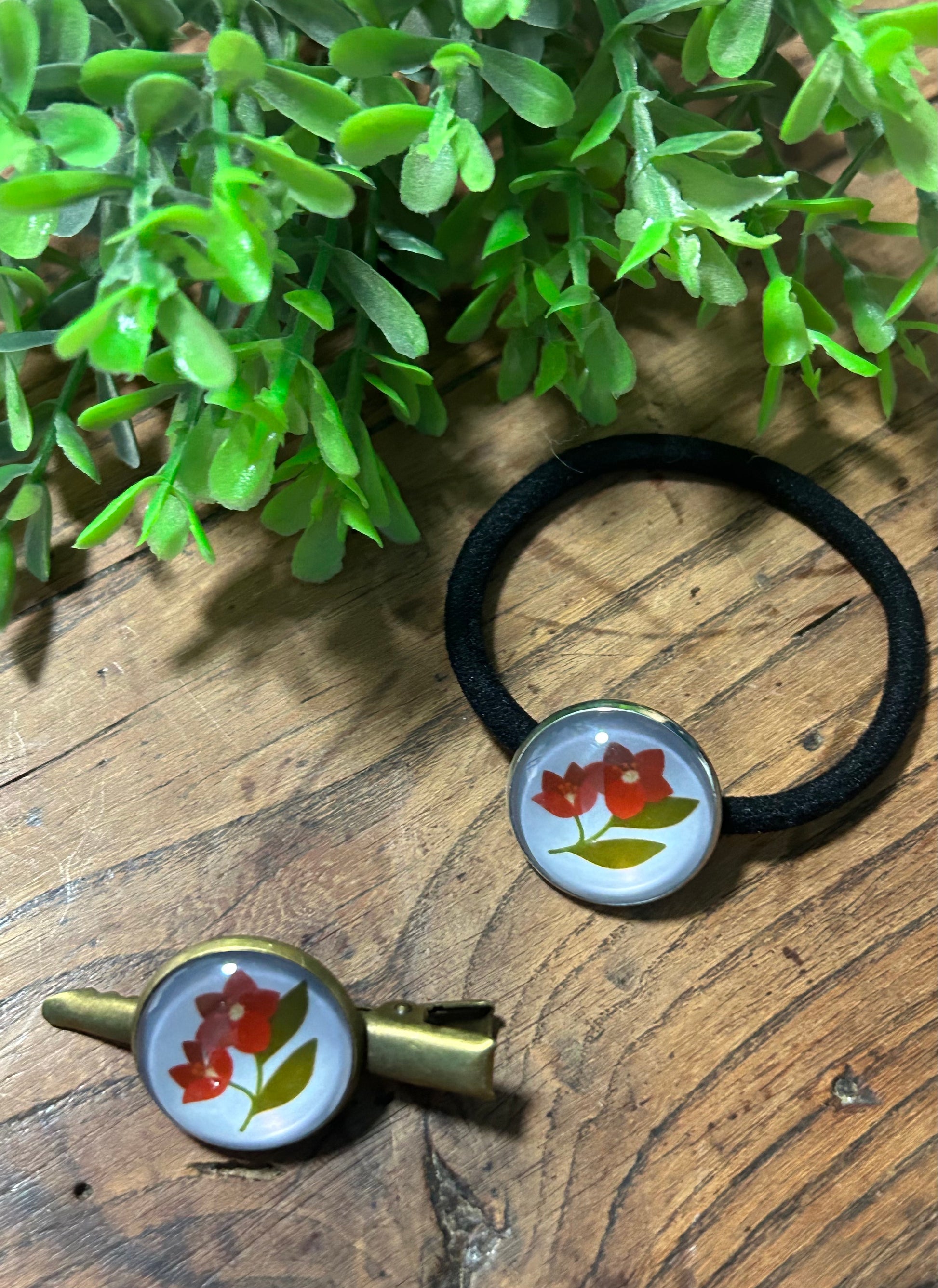 Un duo d’accessoires à cabochons pour cheveux, une barrette et un élastique . Original et unique !
