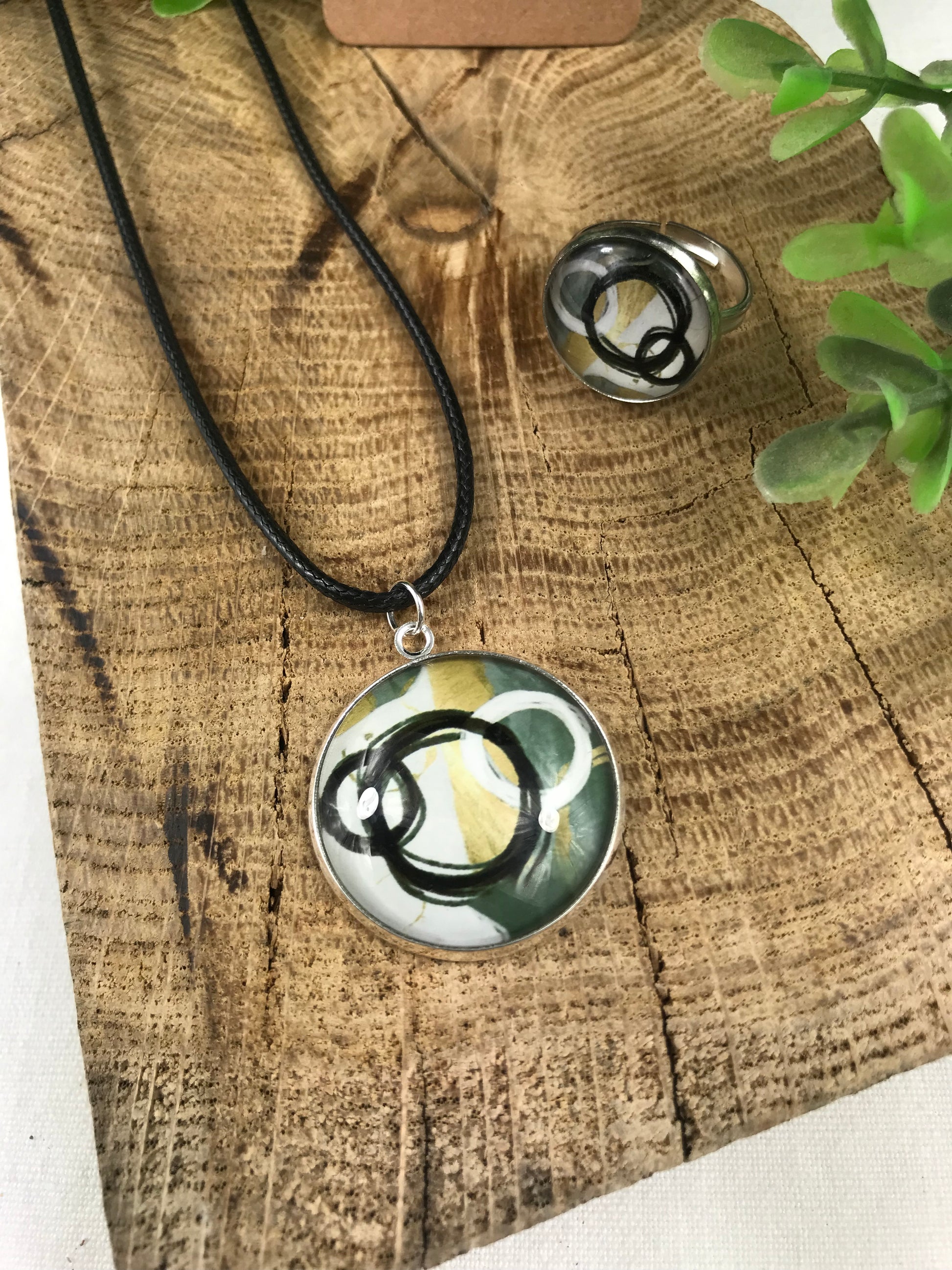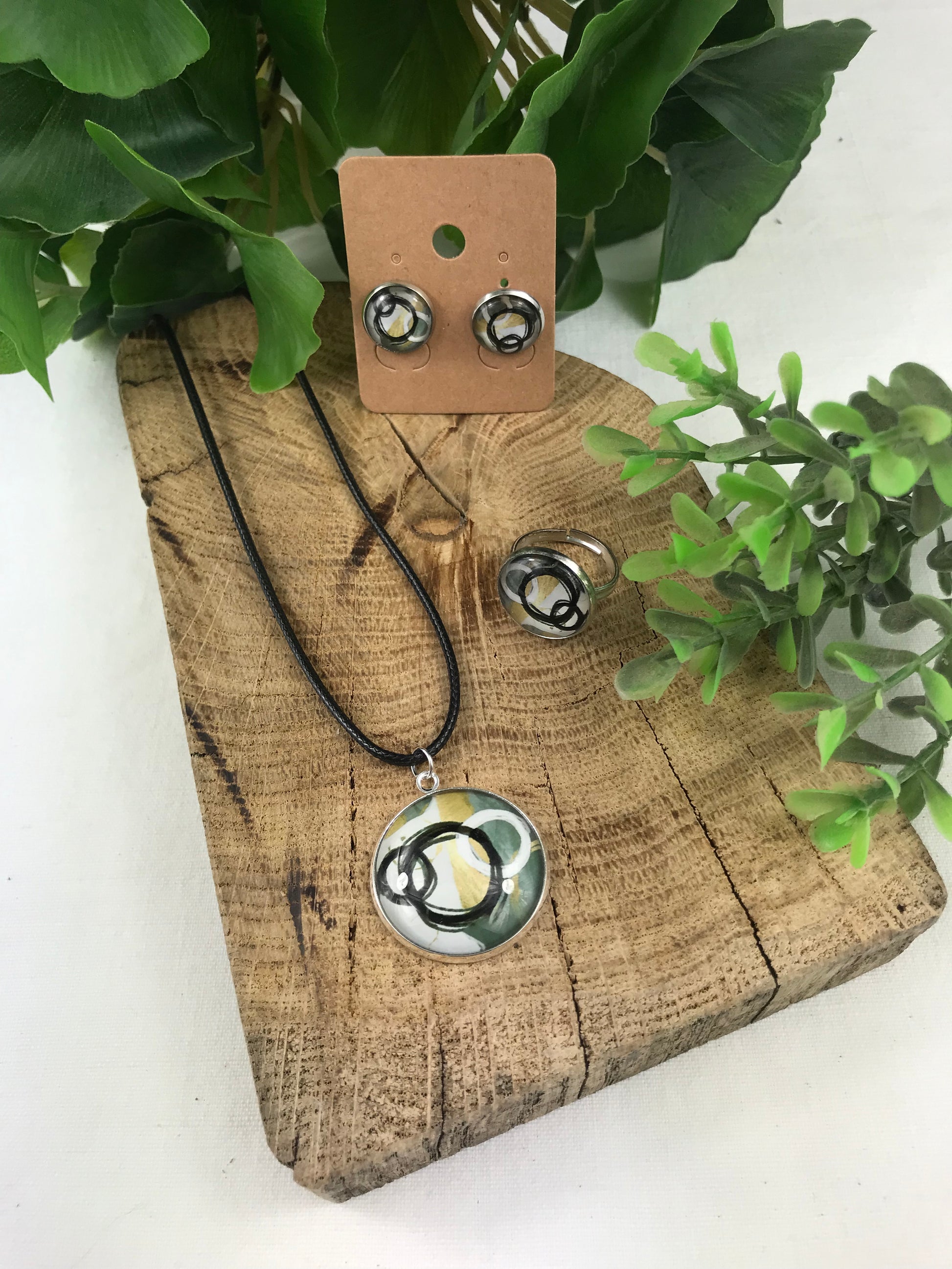 Pendentif, boucles d'oreilles et bague ajustable.